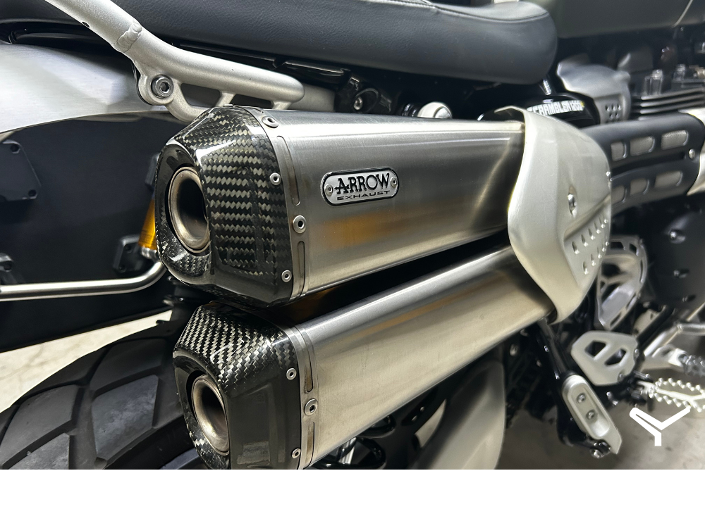 Preciosa Scrambler. Es la versión XE, la más equipada. Cuenta con suspensiones Öhlins regulables adelante y atrás, frenos Brembo, control de tracción optimizado para curvas, modos de conducción adicionales (como el modo off-road pro) y un ángulo de dirección mayor para mejorar la maniobrabilidad en terrenos difíciles.